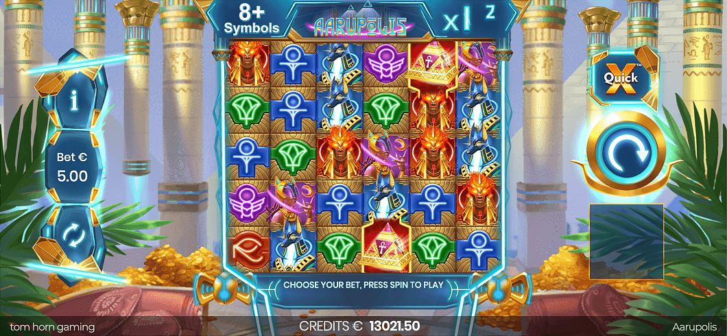 Just like most of Tom Horn’s recent games, also Aaruplis is powered by the supplier’s popular bonus buy mechanic, QuickX™. The feature presents players with three options - to triple their chances of triggering free spins, to spin with a random Wild symbol, and to jump right into the free spins round. All three options are available at the price of x1.5, x15, and x100 the bet, respectively.
