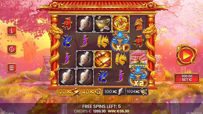 Additionally, Wild Dragon symbols are linked to the Gifts of Fortune bonus game. This  feature adds another layer of anticipation and reward to the game. The Gifts of Fortune are four high symbols - scroll, upgraded by default, coins, vase, and golden ingot.  Players can activate the desired number of the Gifts of Fortune symbols. Depending on their number, players will play with more paylines ( 20, 40, 100, and 1024, respectively) and will unlock Dragon Wilds with higher multipliers.