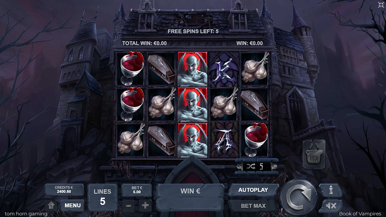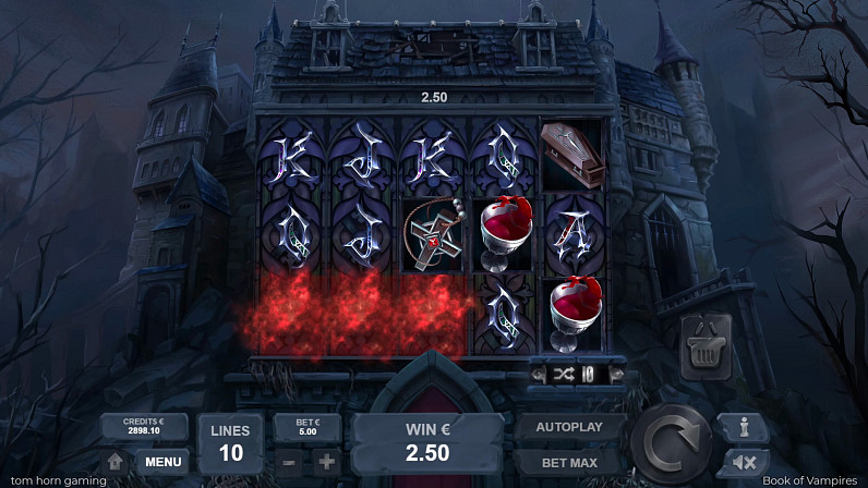 Set in a vampire’s haunted castle, the eerie abode hosts a 5x3 reel set jammed with Dracula-inspired symbols such as silver crucifixes, heads of garlic to ward off the vampires, dark coffins, nocturnal creatures themselves, books, and a number of meticulously crafted Gothic letters representing low symbols.