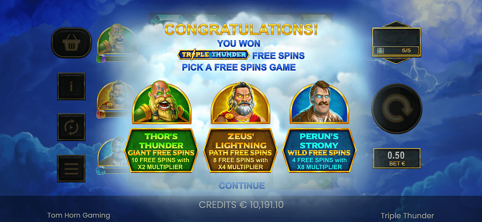 Five scatter symbols award the Triple Thunder Free Spins which come in a bundle from 4 to 10 spins. Players choose the god they will play the free spins round with based on their preference - more free spins with a lower multiplier or less free spins with a higher multiplier.