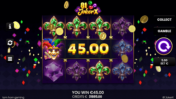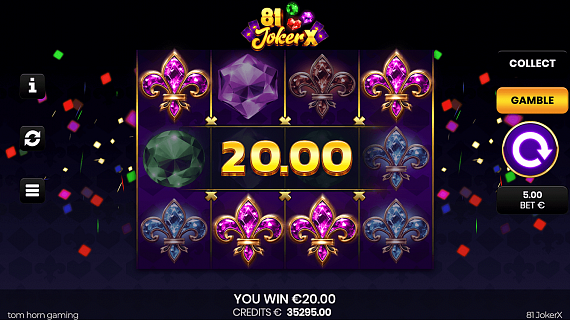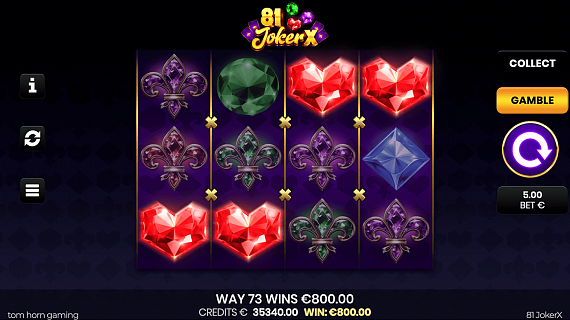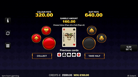 Players can double or quadruple their winnings in the gamble feature. The feature also includes a Joker card, which substitutes for both colours and all suits. In the gamble screen the player has three options - ‘collect win’, ‘gamble win’, or use ‘take half’.