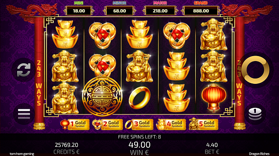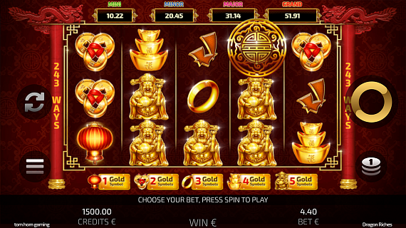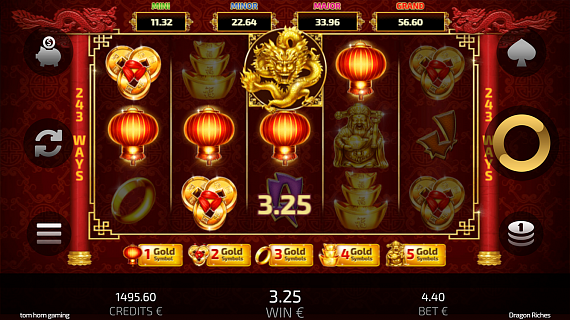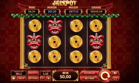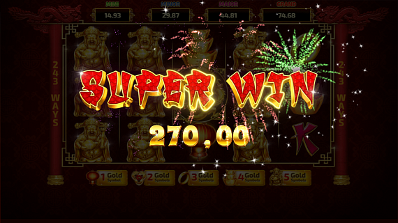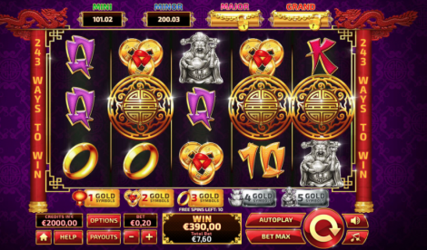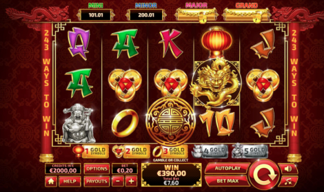 When one or more Lucky Dragon symbols appear, the player will be forwarded to the Pick Up Bonus Jackpot screen. Here, when the player reveals three identical symbols, he/she will win the jackpot. The Jackpot amount is determined by the level of the Gold symbol the player chooses to play from 1 to 5. The amount is not accumulated.