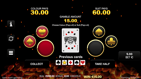 Players can double or quadruple their winnings in the gamble feature.The feature also includes a Joker card, which substitutes for both colours and all suits. In the gamble screen the player has three options - 'collect win', 'gamble win', or use 'take half'.