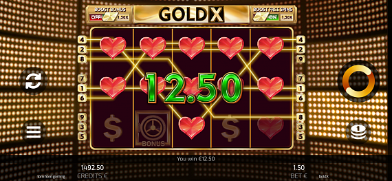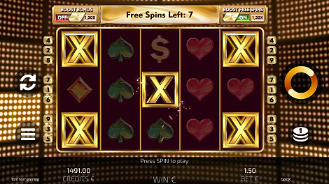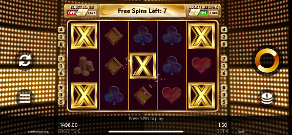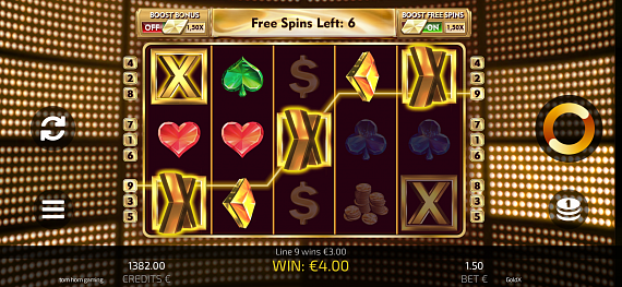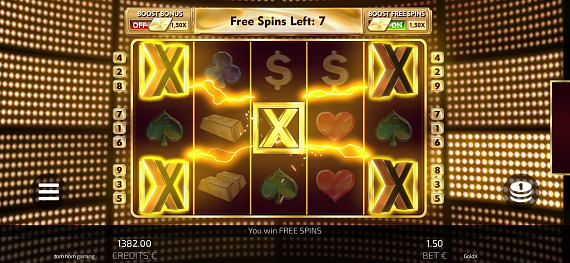 Wild X triggers Gold Free Spins when landing in the middle of the reels. The count of Free Spins is always 7. Throughout the duration of Free Spins, the Wild X symbol is stuck in the four corners and in the middle of the screen, whilst acting as a regular Wild symbol. Free Spins are not retriggerable.