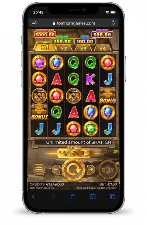 Any win on the screen activates the SHATTER mode. Win combinations shatter to allow for new symbols to appear in order to form new winning combinations. A maximum count of SHATTER rounds is 4. A win MULTIPLIER increases with each SHATTER round up to 4. The SHATTER mode comes to an end when the MULTIPLIER reaches x4 or when no winning combination appears on the reels.