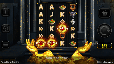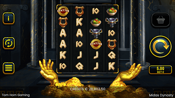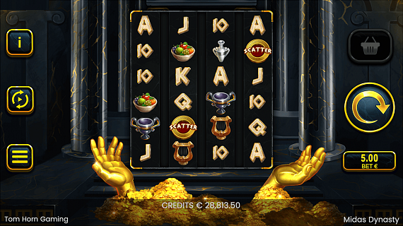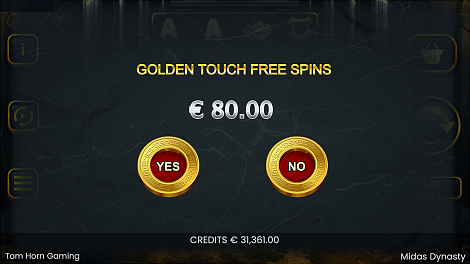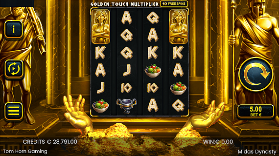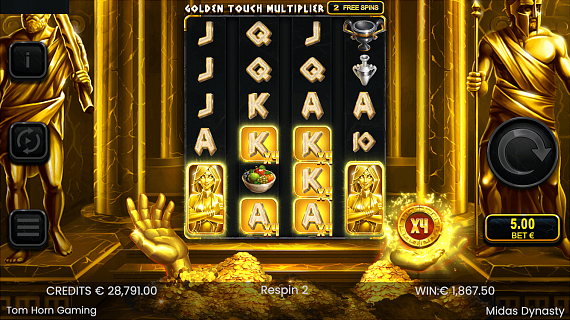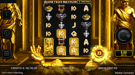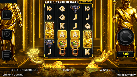 When the WILD Midas symbol lands on the screen in a winning combination it triggers the GOLDEN TOUCH UPGRADE RESPIN. The upgraded symbol is indicated by the left hand at the bottom of the screen. During the respin, symbols which appear in a winning combination are upgraded by one level (symbol) according to the paytable. The feature ends when no new win appears.