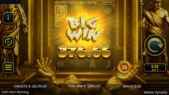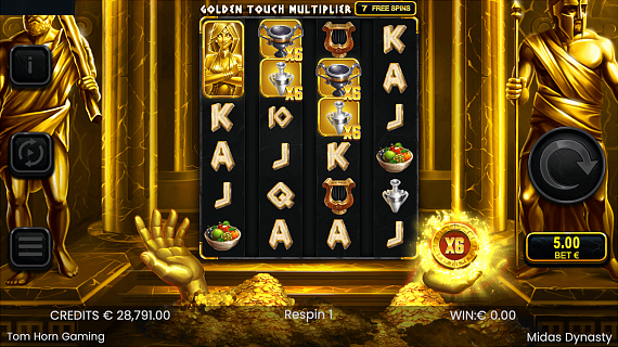 The feature is activated when the WILD Midas symbol is part of a winning combination which triggers a respin. During the GOLDEN TOUCH MULTIPLIER RESPIN, an additional payout MULTIPLIER is applied. The MULTIPLIER is picked randomly and it is displayed on the right hand at the bottom of the game window, ranging from x2 to x8. During the respin, the symbols in the winning combination freeze in place, while new symbols land, increasing the chance of new wins appearing on the screen. The win MULTIPLIER increases with each new respin up to x8. The feature ends when no new win appears.