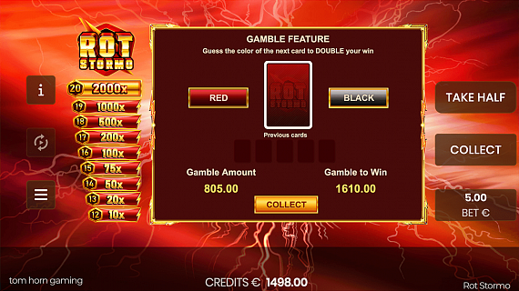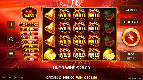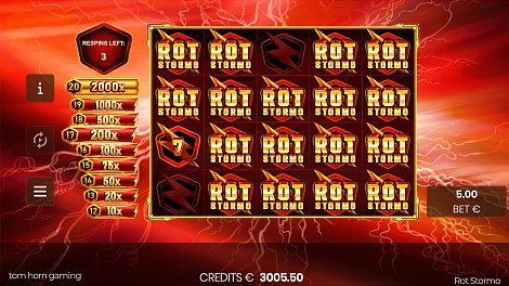 The feature is triggered by 6 or more ROT STORMO symbols. During the ROT STORMO HOLD&WIN RESPIN feature, only ROT STORMO and ROT STORMO CASH symbols can appear. RESPINs are granted at the start of the ROT STORMO HOLD&WIN RESPIN feature. Each new ROT STORMO or ROT STORMO CASH symbol gets locked in place and the RESPIN count is reset to 3. In the case when the feature ends with at least 12 ROT STORMO symbols on the screen, it triggers the ROT STORMO ULTIMATE PRIZE.