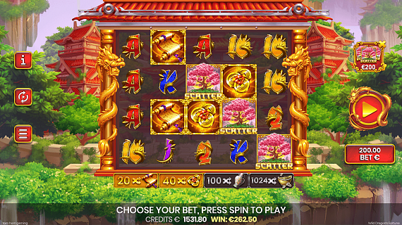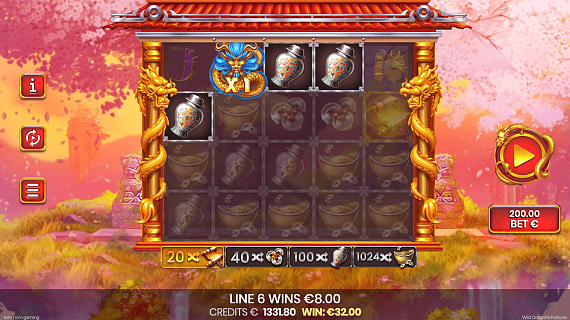 Sakura tree is a SCATTER symbol. FREE SPINS can be triggered when 3 SCATTER symbols land in any position on any reel. During FREE SPINS all DRAGON WILD symbols stay on the reels until the end of the feature, changing their positions and MULTIPLIERs with each spin. In addition, GIFTS OF FORTUNE symbols multiply all winnings in FREE SPINS by the amount equal to the player's bet MULTIPLIER from the base game spin which triggered FREE SPINS. DRAGON WILD symbols appear in the first spin in FREE SPINS. Reappearing of the SCATTER symbol in FREE SPINS adds +1 FREE SPIN for each SCATTER symbol.